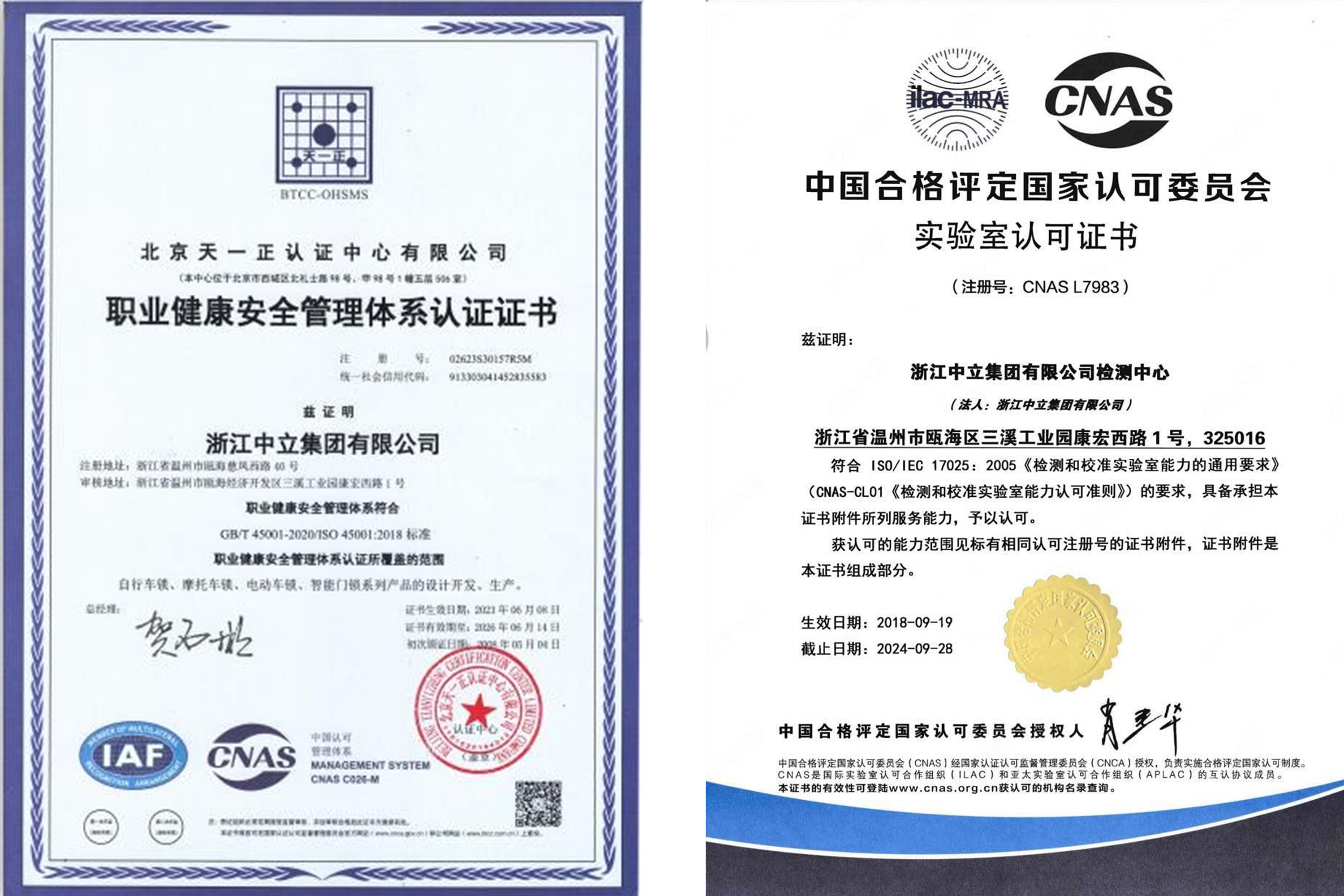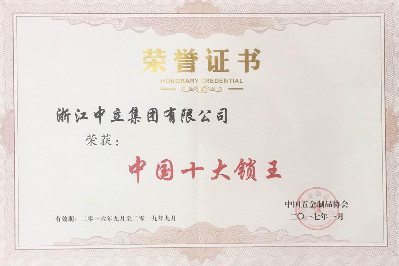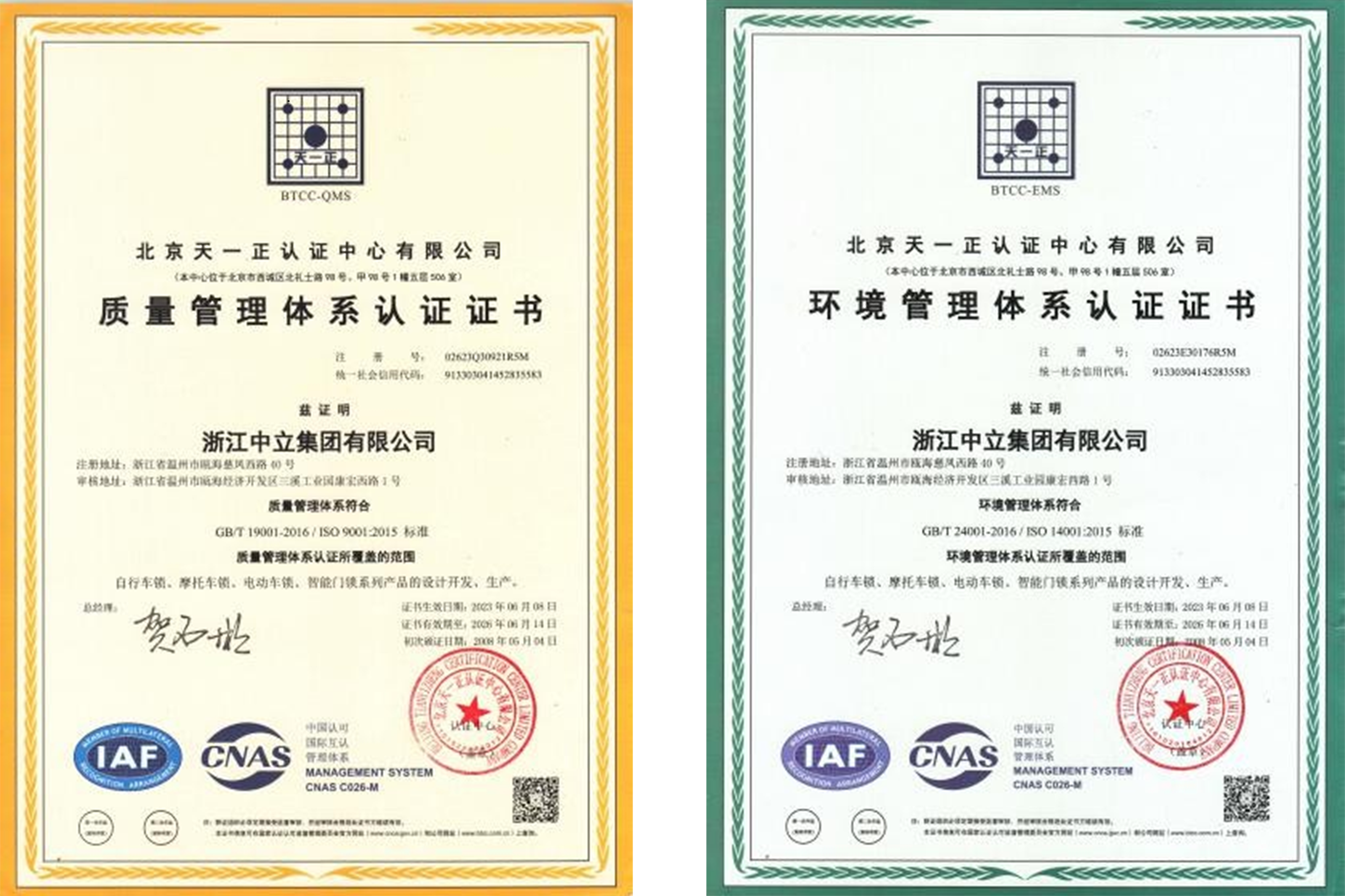 公司是中國(guó)十大鎖王,中國(guó)自行車鎖具中心,全國(guó)五金制品行業(yè)優(yōu)秀企業(yè)公司。中立集團(tuán)檢測(cè)中心通過(guò)中國(guó)合格評(píng)定國(guó)家認(rèn)可委員會(huì)(CNAS)認(rèn)可。公司已獲得二百多項(xiàng)專利授權(quán),主導(dǎo)產(chǎn)品為浙江名牌產(chǎn)品,“中立”商標(biāo)為浙江著名商標(biāo)。設(shè)有浙江省博士后工作站;獲甌海區(qū)政府質(zhì)量獎(jiǎng)。已通過(guò) ISO 9001 質(zhì)量管理體系認(rèn)證、ISO 14001 環(huán)境管理體系認(rèn)證和 ISO 45001 職業(yè)健康安全管理體系認(rèn)證。并建立了社會(huì)責(zé)任體系,接受 BSCI 審核。
