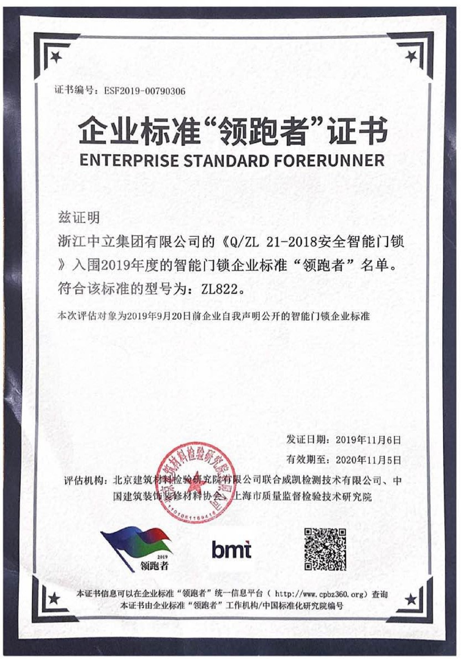 1009—2018《電子智能門鎖》、浙江制造團(tuán)體標(biāo)準(zhǔn) T/ZZB 1222—2019《自行車鎖》、浙江制造團(tuán)體標(biāo)準(zhǔn) T/ZZB 2881—2022《摩托車鎖》制(修)訂。已獲得 218 項(xiàng)專利授權(quán),15 項(xiàng)發(fā)明專利。主導(dǎo)產(chǎn)品為浙江名牌產(chǎn)品,“中立”商標(biāo)為浙江著名商標(biāo)。中立集團(tuán)技術(shù)中心為省企業(yè)技術(shù)中心,省高新技術(shù)企業(yè)研究開發(fā)中心(新型鎖具),設(shè)有浙江省博士后工作站;設(shè)計(jì)中心是溫州市工業(yè)設(shè)計(jì)中心。中立集團(tuán)獲甌海區(qū)政府質(zhì)量獎(jiǎng),并建有甌海區(qū)工匠大師工作室。